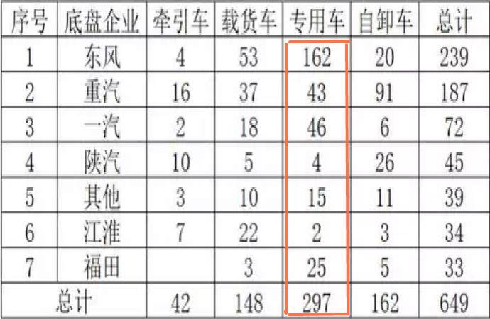 橫向比較幾款整車可以發(fā)現,牽引、載貨、自卸大多為主機廠自己申報,而國六專用車產品多為改裝廠申報,所以是“兵家必爭之地”。