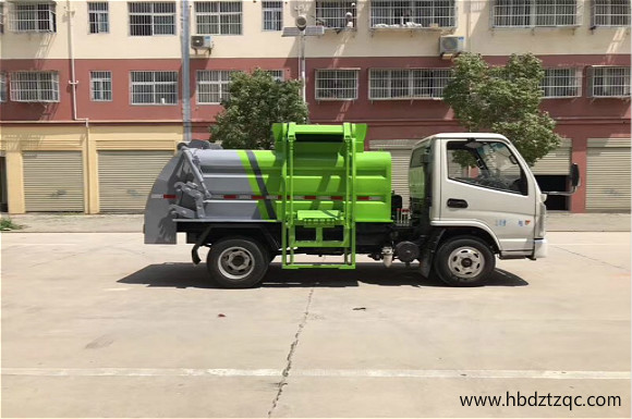 裝載餐廚垃圾: 裝載餐廚垃圾時(shí),將裝有餐廚垃圾的垃圾桶(120L, 240L標(biāo)準(zhǔn)垃圾桶)安裝在提升架上,操作電控箱內(nèi)推板回控制開關(guān),先將廂內(nèi)的推板退回初始位置,打開入料口上蓋(推板沒有回位、上蓋沒有打開時(shí)提升裝置不能工作)操縱控制箱內(nèi)的裝載手柄,隨后操縱提升手柄,提升架帯著垃圾桶開始上升,上升過程中,垃圾桶先被鎖緊在翻轉(zhuǎn)架上,從而保證垃圾桶翻轉(zhuǎn)自如而不會(huì)脫鉤,垃圾桶提升到廂體上的入料口時(shí),翻轉(zhuǎn)架開始翻轉(zhuǎn)使垃圾桶傾斜,將餐廚垃圾全部倒入垃圾廂內(nèi),實(shí)現(xiàn)餐廚垃圾的自裝功能。垃圾倒入廂內(nèi)后,操縱手柄使垃圾桶放下來。