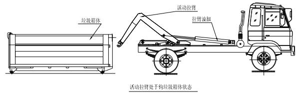 步驟 9. 垃圾箱放置好后,調(diào)整活動(dòng)拉臂鉤與箱體彎鉤位置,使其脫鉤,將拉臂操作手柄推下到落下位置,拉臂油缸收回,活動(dòng)拉臂繞翻轉(zhuǎn)翻轉(zhuǎn)架前鉸鏈軸旋轉(zhuǎn),活動(dòng)拉臂放回到附 車架上,松開取力器垃圾箱放置完成,整車可以運(yùn)輸行駛;