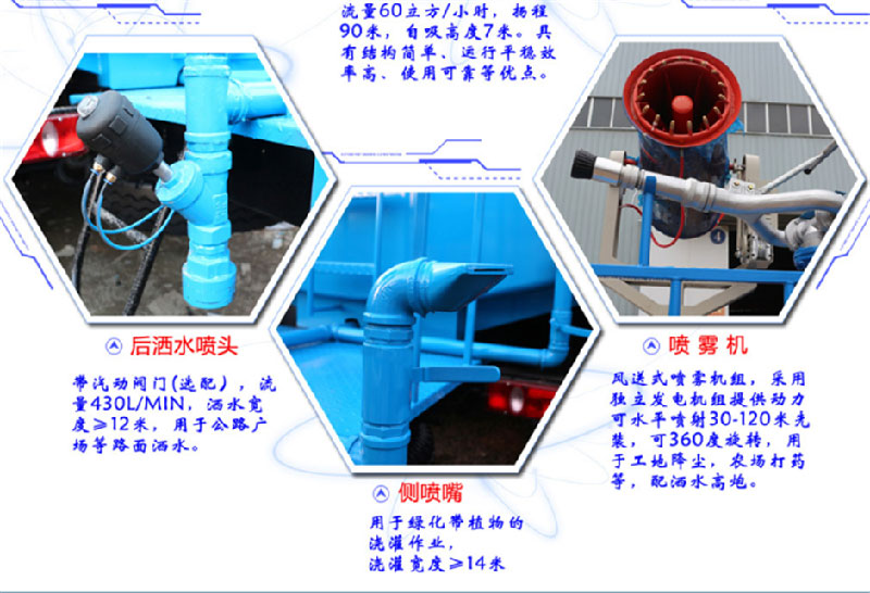 上裝配置:罐體采用國標Q235碳鋼板材制作,產品質量成熟可靠,設計**合理,比同類灑水泵吸程遠、壓力大、使用壽命長,可泵進泵出。前沖、后灑、側噴、高位花灑、帶后工作平臺及綠化灑水高炮(可全方位旋轉,可連續(xù)調成直沖狀、大雨、小雨、毛毛雨等),水位計,消防栓接口、快速接口、兩根輸水管,其余標配。